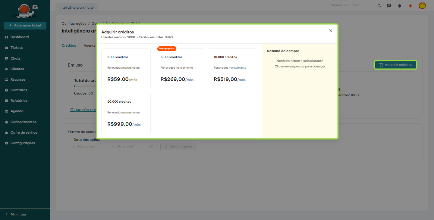 📌 Você será direcionado para a página de gerenciamento dos créditos e agentes de IA.