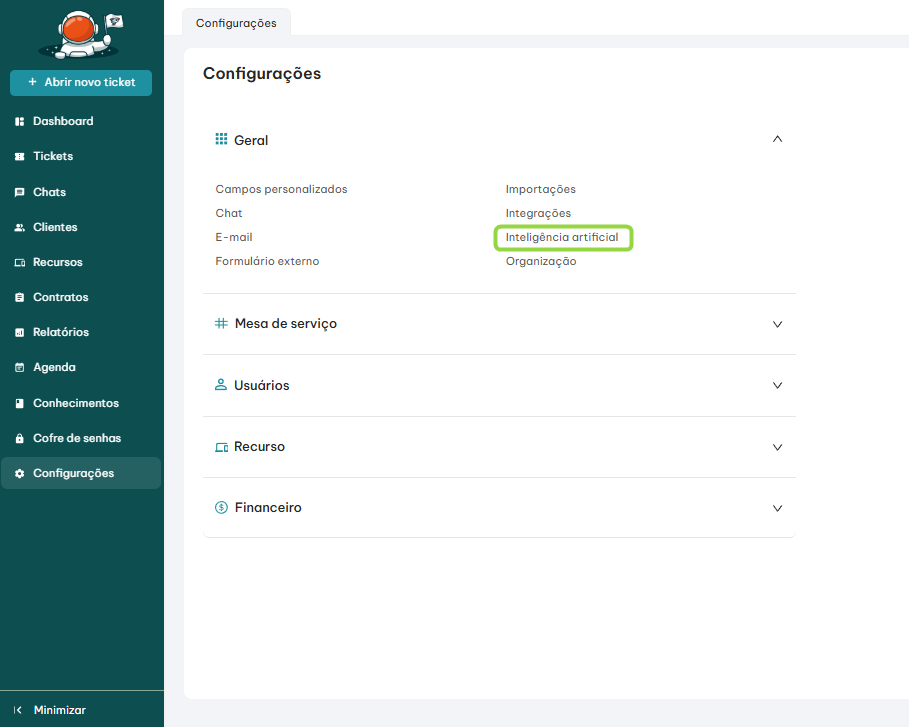 * Na seção **“Geral”**, localize e clique em **“Inteligência artificial”**.