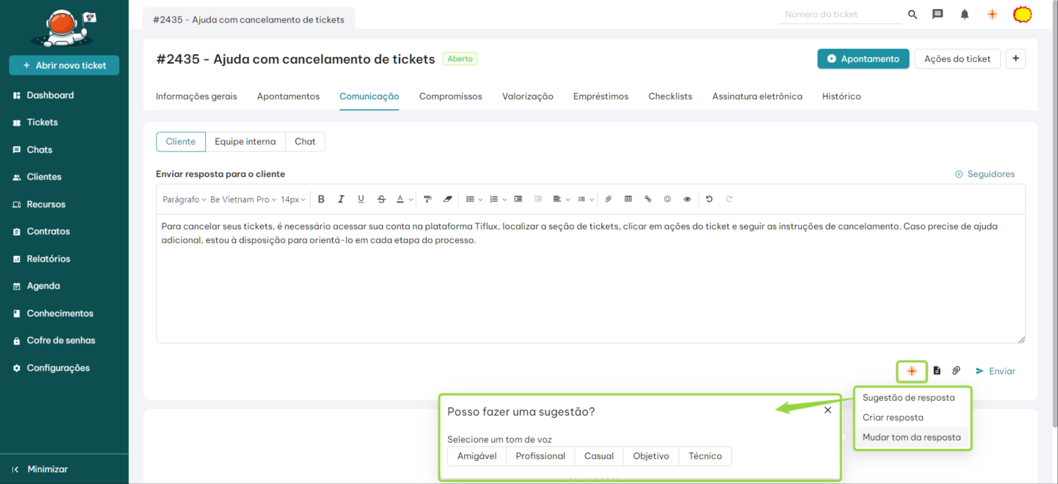 * Botão **"Mudar tom da resposta"**: IA gera sugestões em tons como **amigável, profissional, casual, objetivo e técnico**.