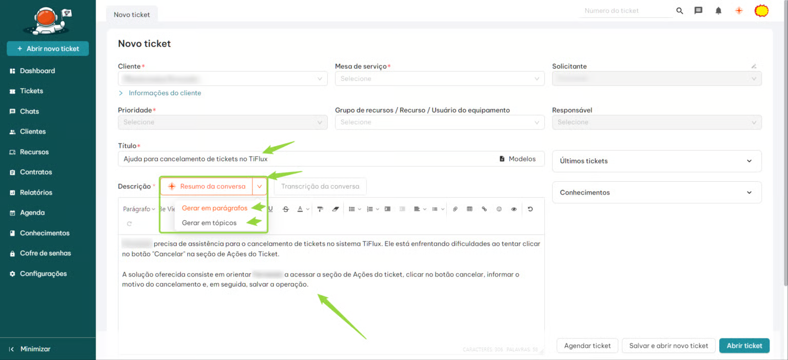 * Possibilidade de **resumir conversas anteriores** e atualizar descrição do ticket.