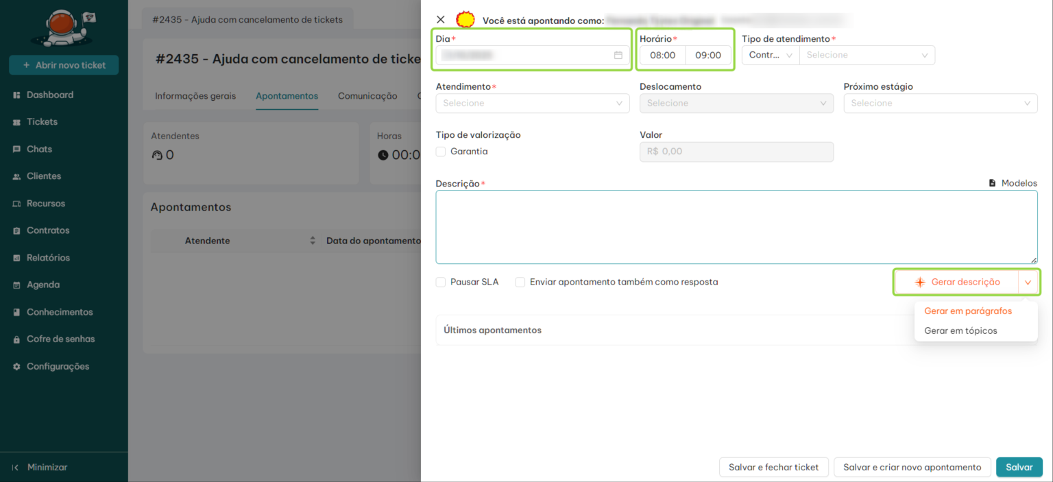 * Em novos apontamentos, botão **"Gerar descrição"** insere automaticamente um resumo das interações relacionadas.