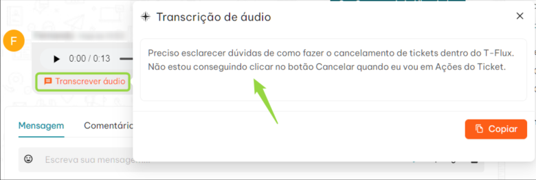 Os áudios enviados no chat (por cliente ou atendente) são automaticamente convertidos em texto legível ao clicar em **Transcrever áudio**.