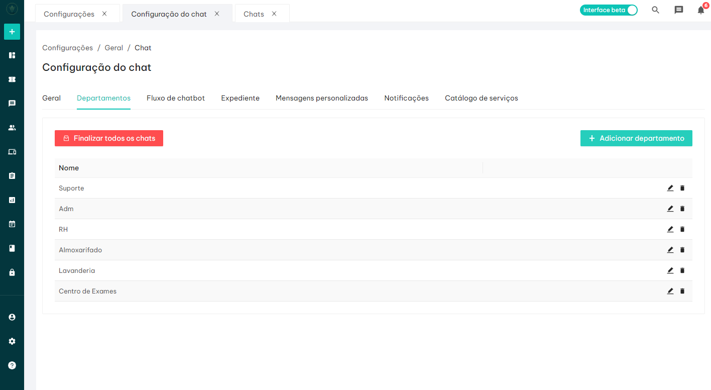 Para editar as configurações dos departamentos, clique no ícone de lápis ao lado do nome do departamento correspondente.