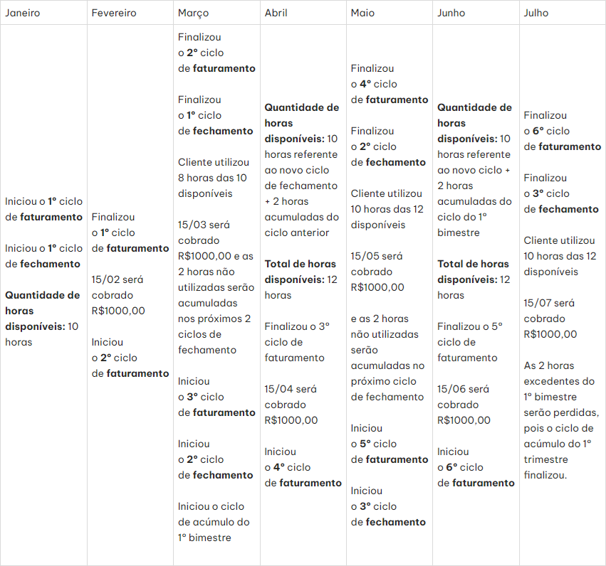 Contudo, se durante o bimestre o cliente utilizar 8 horas, as 2 horas não utilizadas serão acumuladas no próximo ciclo de fechamento.