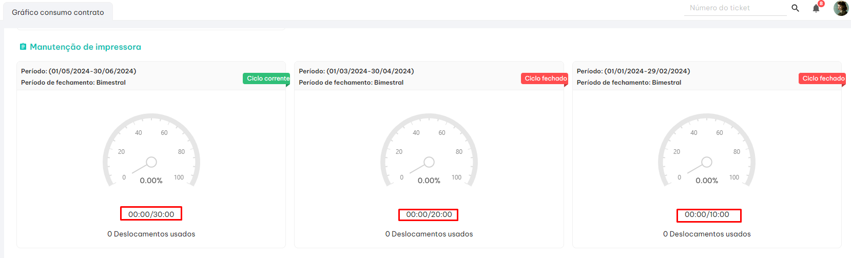 **Observação:** Os contratos a baixo foram realizados com a mesma configuração do exemplo a cima, contudo não houve nenhum consumo de horas, então perceba que foram somados 10 horas a mais a cada bimestre (ciclo de fechamento).