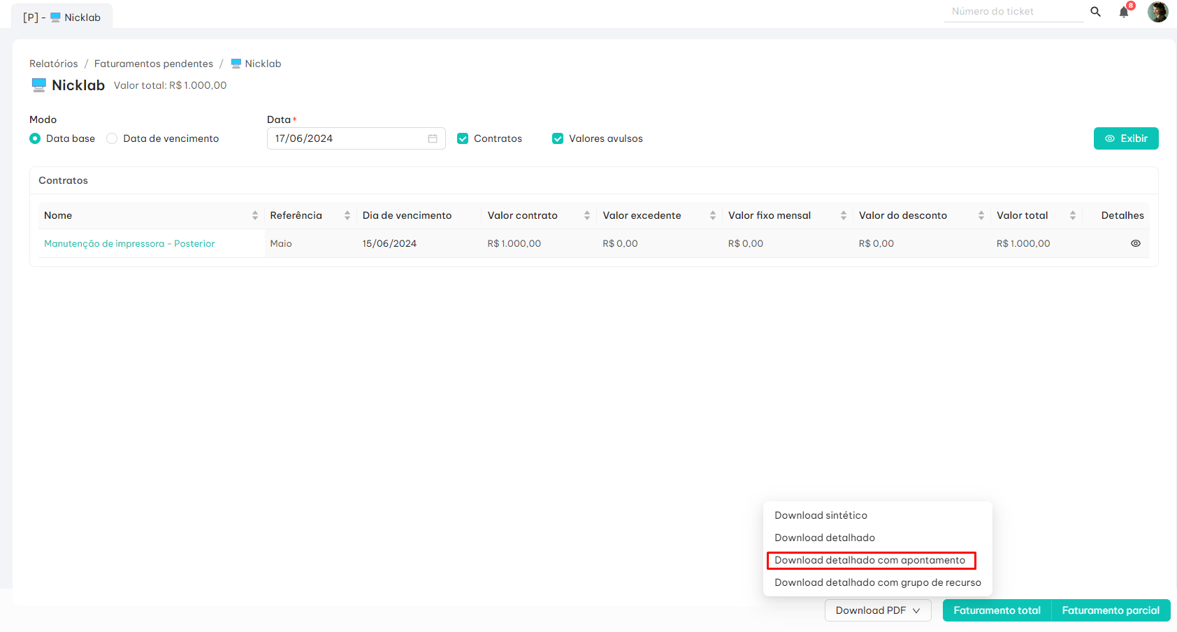 Acesse o relatório Faturamentos Pendentes e clique em Download detalhado com apontamento: