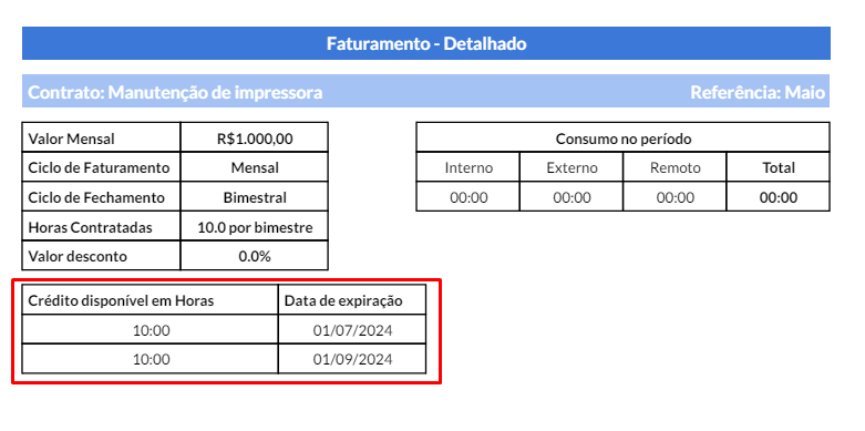 No final do bimestre seria cobrado o valor mensal de R$  1000,00 do cliente e as 2 horas que sobraram poderiam ser usadas até final de junho, ou seja, a data de expiração dessas 2 horas acumuladas seria 01/07.